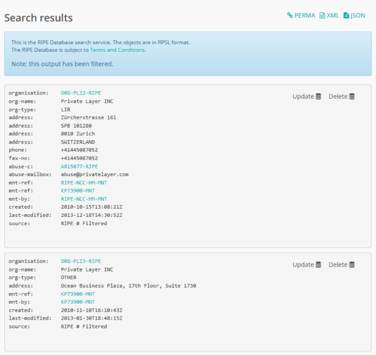 But even here it cannot be found. A personal visit to Panama in 2015 at the address given by RIPE NCC led to an office building, but no Private Layer Inc. company could be located there. There was no Private Layer office on the 17th floor, no mailbox and no Private Layer bell button.