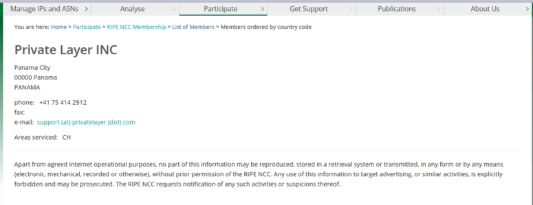 Nevertheless, a company such as Private Layer from Panama can become a member of RIPE NCC, receive an Autonomous System Number (ASN) and assign IP number ranges that it has previously received from RIPE NCC.