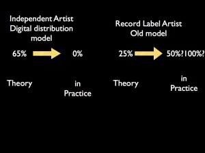 Since i left my band DEEE-LITE , best known for “groove is in the HEART” and the cult classic album “DEWDROPS IN THE GARDEN” yet…I can’t afford to pay my new band to get them rehearsed or on the road , nor a one day a week secretary to help with merchandise,emails,web maintenance,etc…let alone mix down and master high quality versions of these tracks for my first 4 albums , waiting in the wings, nor pay the editors for my videos. I’m NOT WHINING AND LOVE WHAT I DO but your article sums up why it’s nearly impossible to stay in business . My royalties were stolen by my former accountant and attorney for 22 years and so i only began receiving money for new record sales this year although multi-millions were sold but after being robbed for every record sale , I’m still in the game due to radio play. I spoke on apples panel in 1994 about the future of music and digital distribution with much hope for the future as well as at the “future of music BS summit” convention where i met several of these so-called artist empowering co. presidents on panels where i was “the artist ” on the panel and you have got the situation correct. these guys only care about money and have been forced to make deals with the majors to play the majors current puppet in order to have access to play vital artists such as the temptations ,etc…. these current puppets get fame but no money- nothings really changed much there. Thanks for posting this TRUTH. i only disagree with a few points about the majors . ours refused tour support and i funded that myself and never gave us large advances or any art budget sighting that our music was “too black and too gay”. i don’t agree that any artist on a major ever received more than 27% according to my research most received 12% and is including the producer- ourselves.. I have faith that a corporate sponsor will endorse my tour one day as the music will be just as inspiring whenever it is released but until things change i’m stashing my joints as most other experienced artists i know are doing. i had plans and still do, to sell my indie music on my own site , such as prolific artist and geek JUNIE MORRISON from pfunk and ohio players does , but as you mentioned, all the fake artist sites set up by Facebook have directly halted the traffic to our own personal sites which is makes it increasingly difficult to maintain for lack of funds . I never started a Deeelite site on Facebook or any other site – but there they are- vapid and unmaintained except by a random fan who stumbles across the site and can’t tell the difference. If Facebook cared about artists- they would post the artist’s website large and clear with a link….but they don’t care about artists . James brown said “to stay in the music business is 75% business and 25% music” and that runs in my head daily as i watch young artists rise and then run out of steam and fall before they complete one tour and release their first album. I’m in this for life and have had to turn to deejaying to stay in business . You also forgot to mention that since everybody has a mobile phone- original lyric ideas ,chords, dance moves, style, overall sound get’s swooped up at live shows via ‘cool hunters’ with mobile cameras and co-opted by artists and advertisers that are not as creative before I can even release my album- so the tradition of polishing your act “live” is also a risk not worth taking anymore. I am hopeful about the future yet cautious , protective,and patient at the same time. Great music will always find a way to be heard, unfortunately , like most artists thru ought history, it won’t be in the artists lifetimes. i keep wondering about all the business people whoo were fired from the major and why they don’t contact the original,unique,hardworking artists, to try and start a new platform ????? i suppose they went into porn. thanks for your fantastic article. 5 stars!!!! Lady Miss kier from deee-lite.