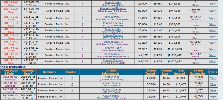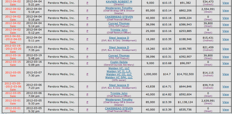 Meanwhile Tim Westergren continues to sell an average of a million dollars of Pandora stock a month.