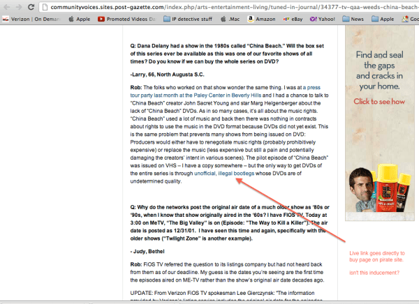 You’d think a newspaper writer would understand that the reason he/she hasn’t got a raise in 10 years is due to content theft. And you’d think they’d not encourage people to buy pirated material. You would also think that a respectable company Post Gazette wouldn’t want to send their readers into the arms of scammers, mobsters and terrorists. Think again.