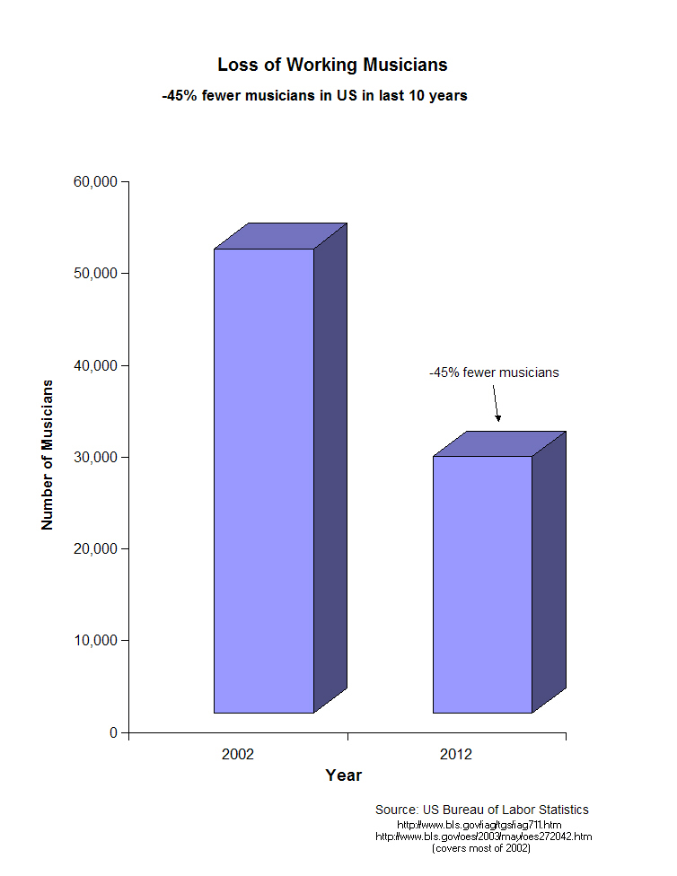 That analysis is nonsense! The fact is that there are fewer professional musicians, making less, but these conclusions are wrong! It has everything to do with the ever widening diversity: more people taking an increasingly smaller piece of the pie, not less money being made overall. Combine that with the fact that people don’t want live music as much anymore, because of other forms of entertainment they prefer, and you get what we have!