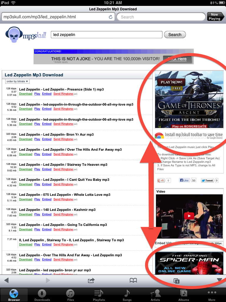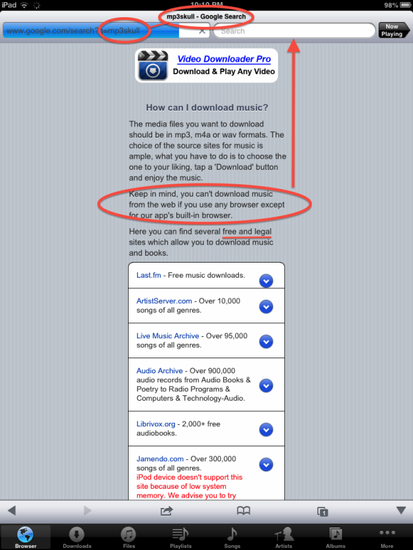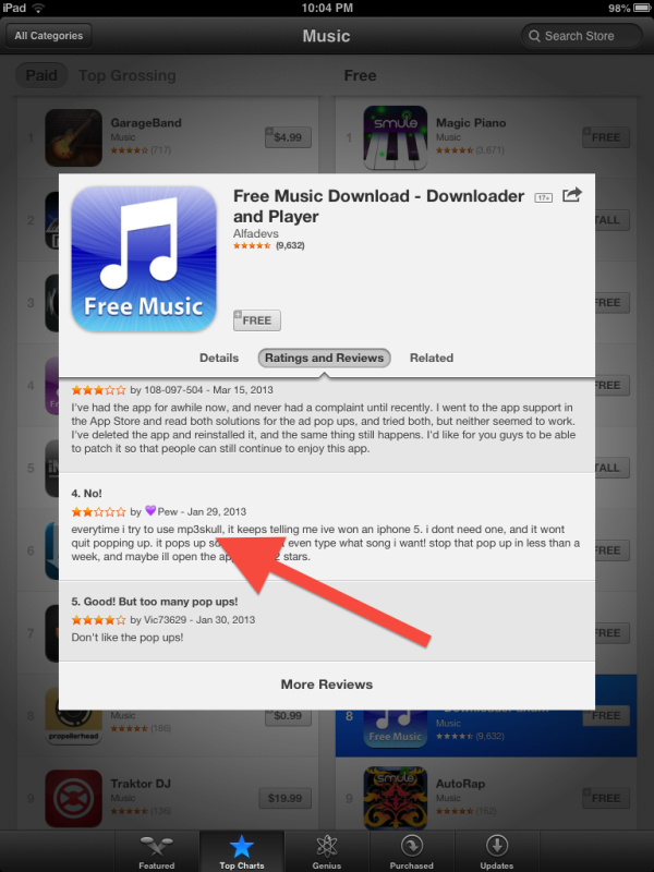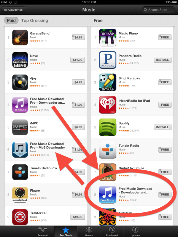 Advertisers need to capture the mobile market. The problem is the functionality of the some of the most frequented websites by the coveted youth demographic is disabled on iDevices (the inability to download content to the idevice). In other words, there is no draw to pirate websites (and to the advertising they serve) if the infringing music is no longer accessible. Worry no more, there’s an APP for that… note the top grossing and most popular music apps for the ipad…
