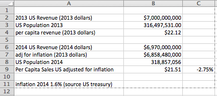 When you adjust for inflation and population growth we see a continuing decline in revenue per head from $22.12 in 2013 to $21.51 in 2014.