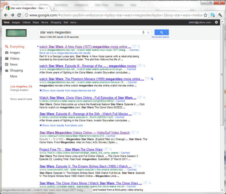 Then Google estimated that there were 4.3 million web pages that had the words “star wars megavideo” on them. Legitimate file locker sites like Dropbox, don’t allow any public links to copyrighted content. In fact Dropbox just banned Boxopus, a torrent tool from using its API.