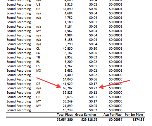 After nearly a year and 80 million plays, the net average per play amounts to less than $375.00 per MILLION Plays on YouTube. Ok, that’s just for the sound recording, there are two other parts to the uploaded copyright, the musical composition and the video content itself. Assuming each of the three parts earns an equal share (why would they not, but how would we know given YouTube’s usual secrecy sauce?), then the full amount payable by YouTube for 1 Million plays via Content ID would be $1,125, or $.001125 per play (on average).