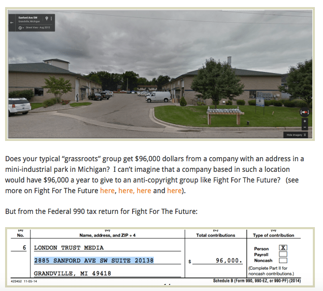 This same company also funds the grassroots non-profit Fight For The Future. We take Fight for the Future to task in the same article for it’s mass copyright infringement campaign against the MLK estate. Fight for the future has also hosted “hard coded” advertisements for PIA/London Trust Media. (Not even sure how that works as a tax exempt non-profit).