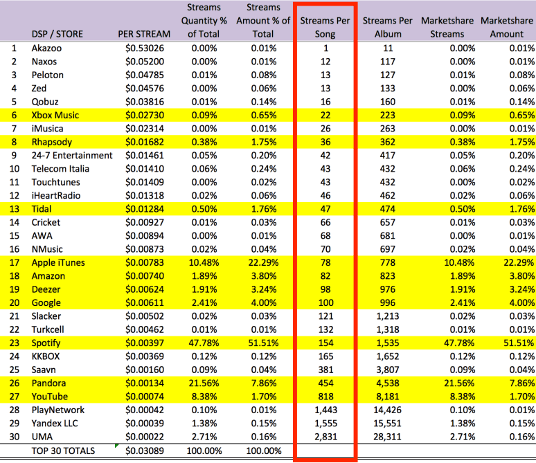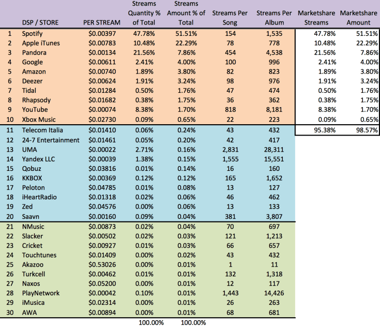 [EDITORS NOTE: All of the data above is aggregated. In all cases the total amount of revenue is divided by the total number of the streams per service (ex: $5,210 / 1,000,000 = .00521 per stream). In cases where there are multiple tiers and pricing structures (like Spotify), these are all summed together and divided to create an averaged, single rate per play.]
