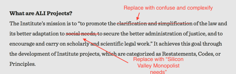 The scandal concerns the ALI’s so-called Restatement of Copyright Project. This project has a multitude of problems. But basically early reports show it is an attempt to stand up a tech industry friendly extra-legal alternative to the copyright act. Pardon the use of this term, but frankly, it is an exercise in “fake lawmaking.”