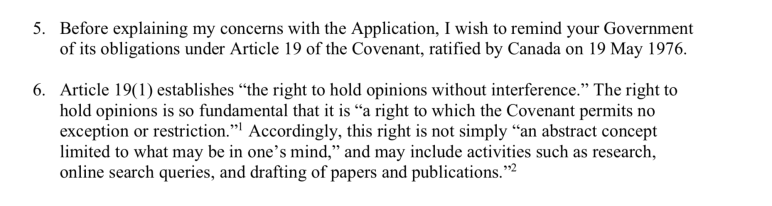 Mr Kaye then references UN article 19 which concerns freedom of expression. This is the covenant with which Canada must comply. But I’m not familiar with this second part. Hmm. Oh! I see, if you follow the footnote that second part is simply another paper by Mr Kayes. So that would be his opinion. It’s not actually in article 19. But that’s maybe okay. Maybe Canada should comply because Mr Kaye does have UN stationery! Even though at the outset he declared his analysis was gonna stick to law and jurisprudence. Seems interesting, let’s give him the benefit of the doubt. So please Professor Kaye, tell us more!