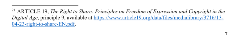 (Editor note: standard footnote formatting rules give away the fact that someone somewhere wanted the public to be confused by the title. Someone choose to list Article 19 the organization, as the Author and didn’t italicize. This is permissible. But this ends up giving it the same formatting it would have if it were law or treaty and The Right To Share a article or subsection of the treaty.)
