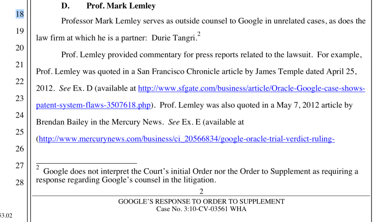 Second according to the a court document commonly referred to in press as a “shill list” (Oracle v Google) Lemley has acted (continues to act?) as outside counsel for Google. He is a long time advocate for Google’s policy positions. He also features prominently in the “Google Academics Inc”, report published by Google Transparency Project. This report details Google’s funding for academic institutions and research, and notes how it appears to have predictable results on the research conclusions produced by academics. That is, the research conclusions generally support Google’s public policy positions. Some have criticized the inclusion of certain professors in this report, but Lemley’s inclusion appears uncontroversial. Lemley unlike many other professors does not seek to hide his connections to Google.