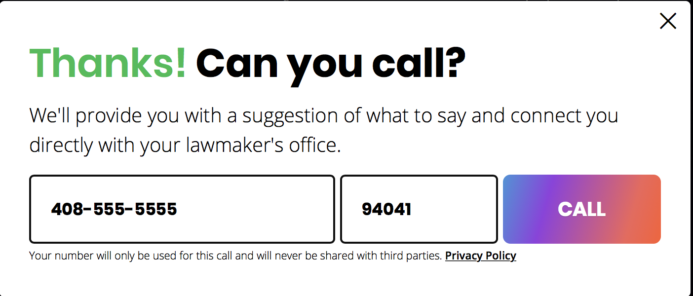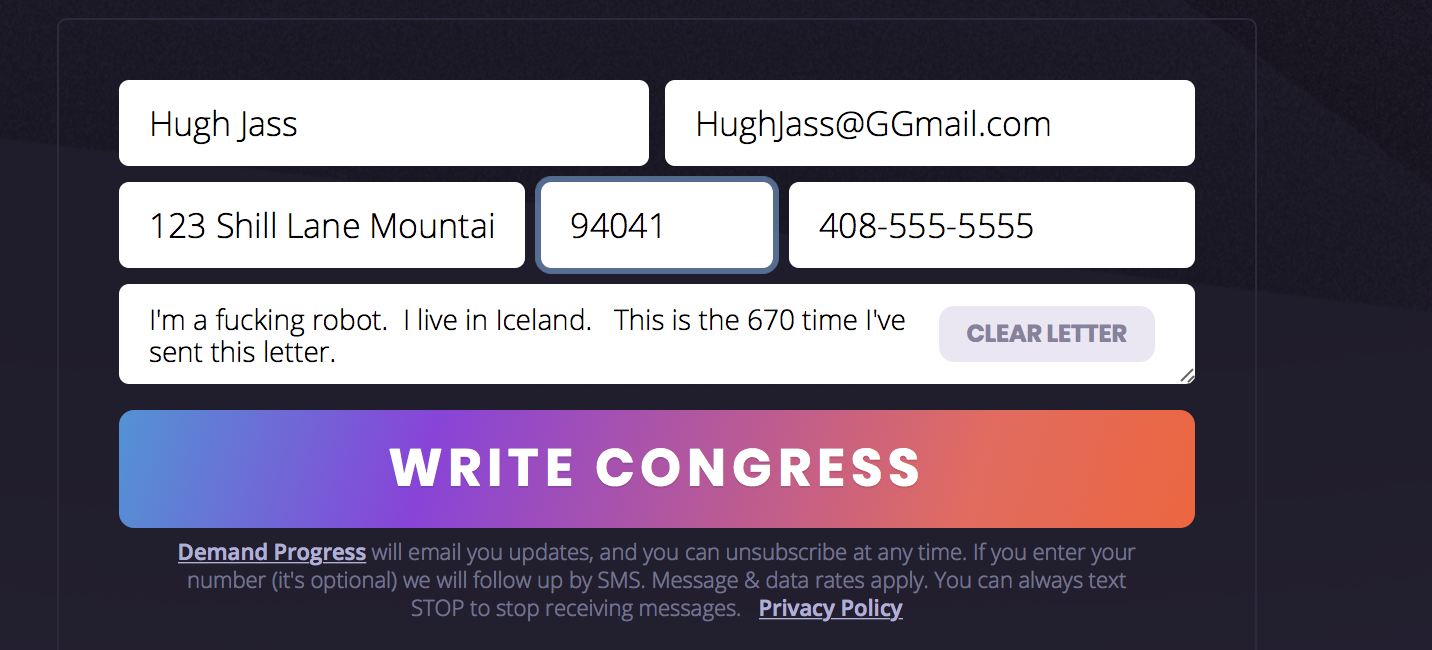 I just checked and these tools are still live. I sent the email above despite the fact it’s a fake email address. I then reloaded the page used my real email, phone number and zip code and I was able to place a call to congress. Strangely I was connected to a random congressional office ( Not related to my phone number, IP location or the postal code.) I told the polite staffer who answered the call that I was very concerned about Federal Emergency Management Agency using high altitude aircraft to spray mind altering chemicals on my hometown as it was producing strange behavior in my cats. All twelve of them. Poor staffers. ( I later identified myself and told the staffer I was conducting an experiment for a article I was writing).