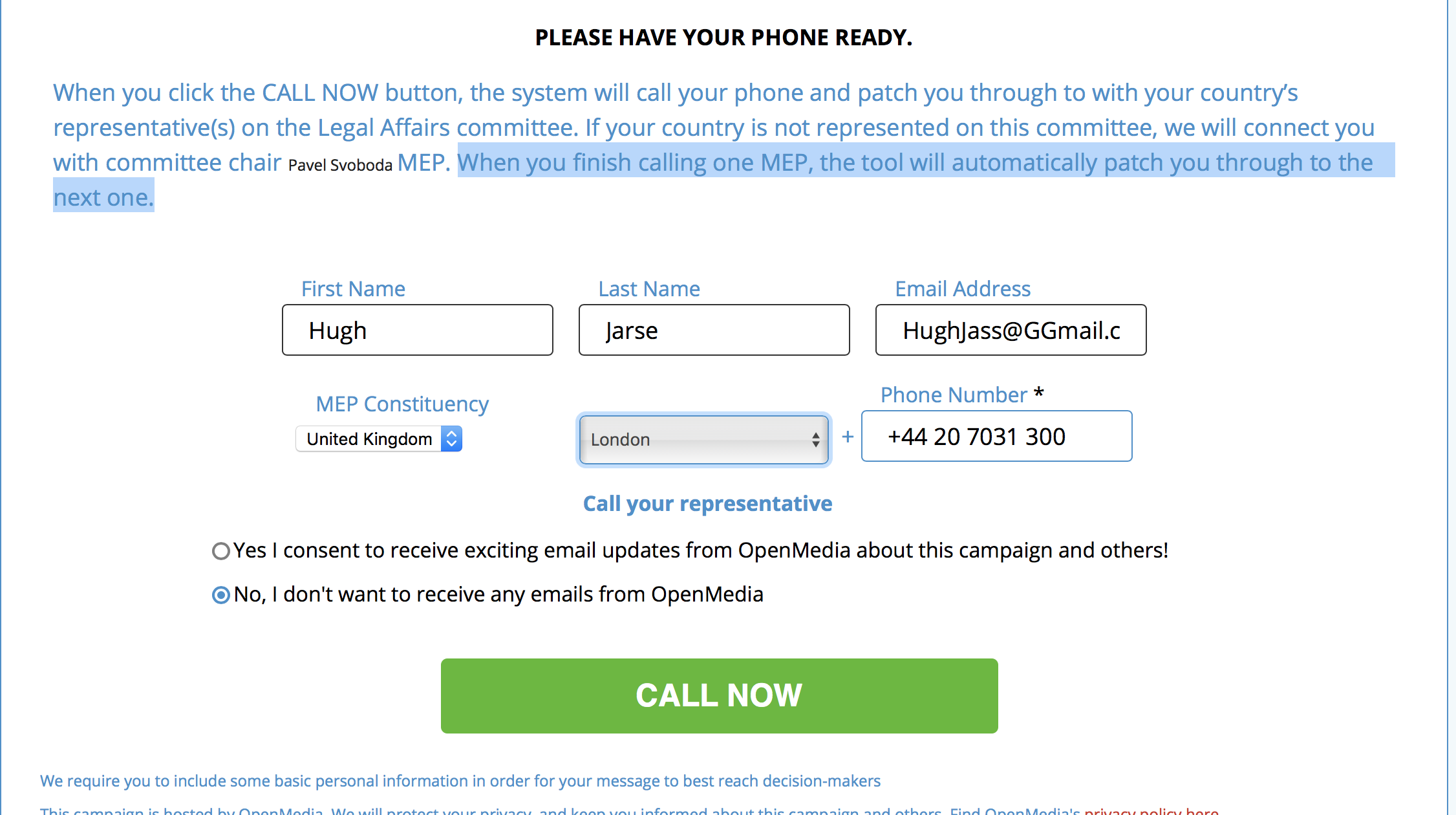 In fact there is at least one of the web pages producing robo calls. This is from the Google proxy Open Rights. I have not tested it but reports from readers is that it works and there is no limit on the number of calls. And email addresses are not verified.