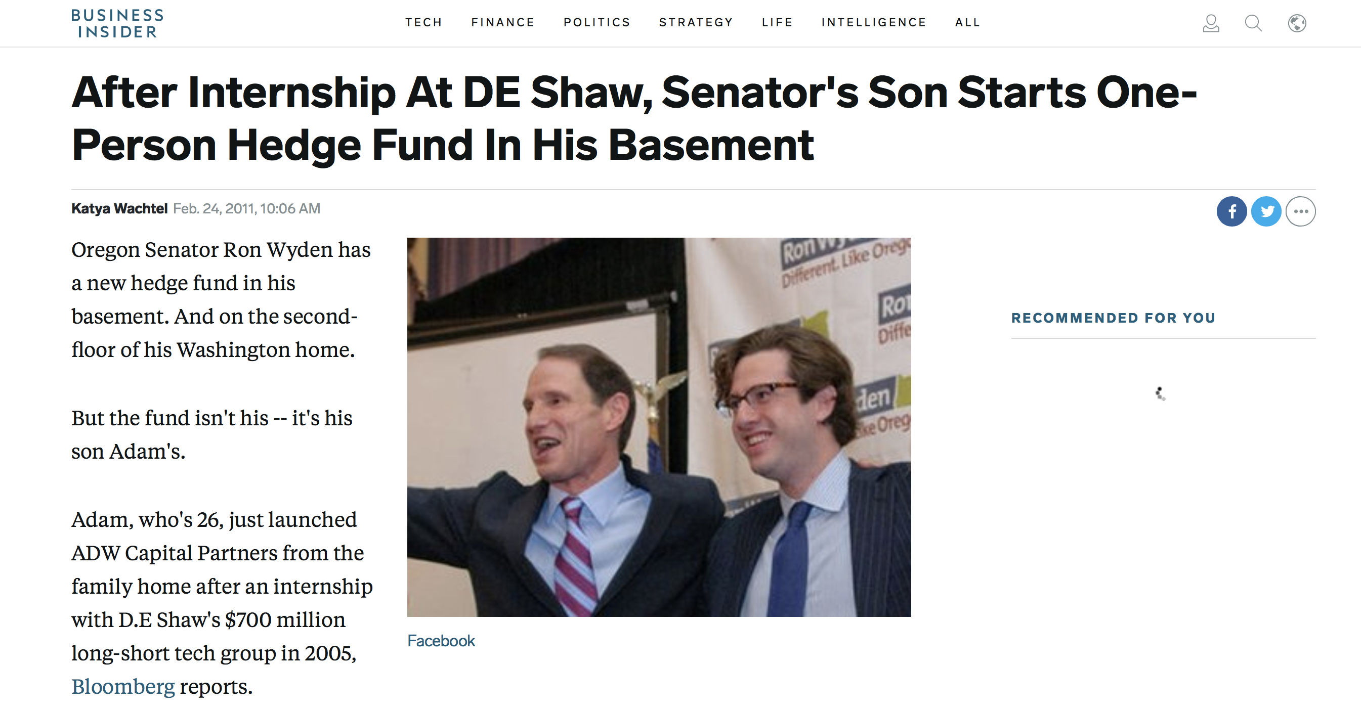Wyden’s son Andrew Wyden went from interning at DE shaw (19 Billion in assets) to owning his own hedge fund in a matter of months. As the article notes David Shaw (Principle at D. E. Shaw) has been a frequent contributor to Sen Wyden and also supported his Super PAC: