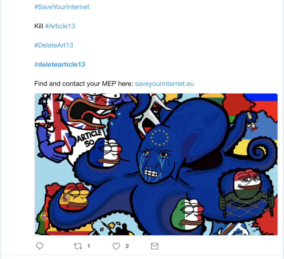 One of dozens of memes featuring “Pepe” urging calls to EU members of parliament against copyright directive. The image is recycled from a Southern Poverty Law Center listed group.