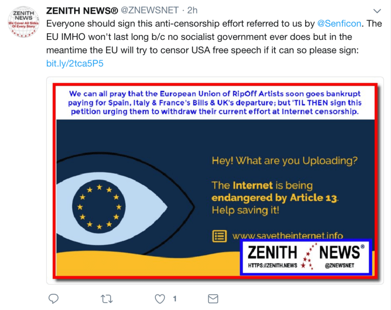 What is clear is that the “don’t break the internet” crowd has cried wolf one too many times. And their attempts to raise a cybermob are falling short. As of yesterday there were only 800 #DeleteArticle13 tweets on twitter. And a cursory examination shows that about 80% of those tweets are from sock puppet accounts.