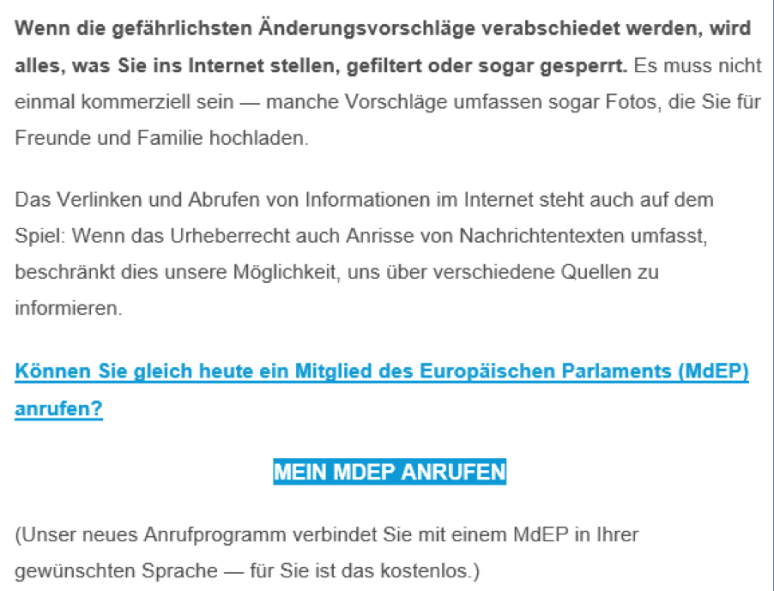 Even Mozilla joined the fray. Newsletter subscribers were invited to phone EU parliamentarians. The “Call now” button even appeared in four different places in a newsletter. And of course the calls were free.