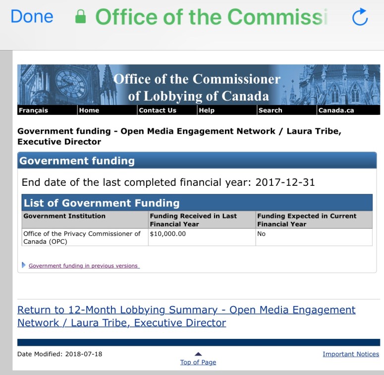 Office of the Privacy Commissioner of Canada provided funds to one of the Google backed astroturf groups engaged in a spam email campaign against Canada’s Minister of Foreign Affairs Chrystia Freeland. The emails urge her to reject the NAFTA treaty based on objections to IP provisions that would strengthen rights of Canadian artists.