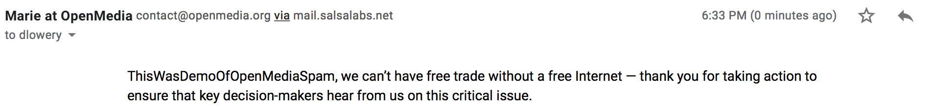 Note: I always let recipient know these were tests and demos. I did this by changing my name to a short explanation. It is clearly working as “ThisWasDemoOfOpenMediaSpam” got a thank you email. Additional precautions were taken so targets would not mistake these communications for real constituent communications.