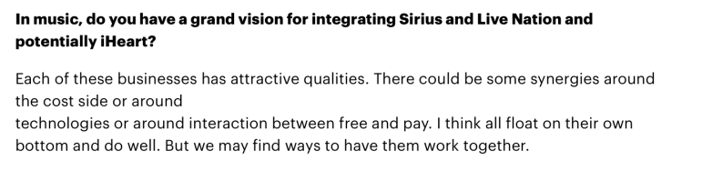 Further Liberty Media seems to be angling to combine Sirius, Pandora, LiveNation-Ticketmaster and even IHeartRadio into a single company. You sure you want to bring up the competition issue? The public outcry to AT&T – Warner tie up was huge! Imagine the difficulty for this merger. That said I’m probably in the minority but depending on how it is done, I don’t necessarily think that a tie up of these properties is necessarily bad for artists. For one I’d like to see some real competition for Apple, YouTube and Spotify. However in order to do this Sirius and Liberty would need to get artists (and seemingly its own radio hosts!) on board. They’d need a really compelling vision. Nickel and diming rights holders, performers and songwriters on the MMA is absolutely counterproductive.