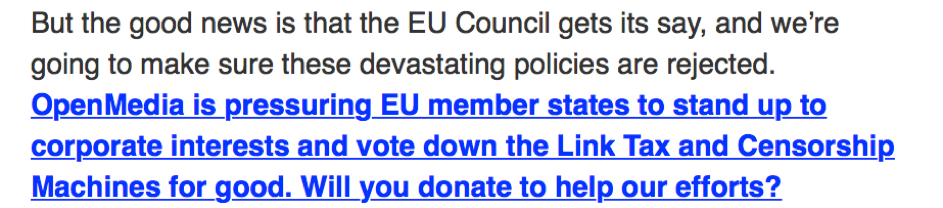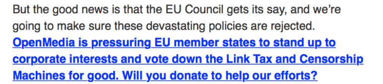 Now, to be crystal clear about this, OpenMedia is a Canadian company. So here we have a Canadian company announcing that it will exert pressure on EU member states to get the EU to change its laws in a way that suits a Canadian company. The situation is absurd, and whether the EU and its parliamentarians will appreciate such external meddling in their policymaking seems questionable.