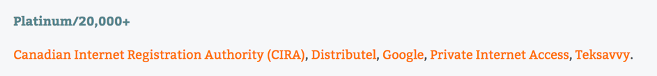 In July 2018, 8 enterprises or individuals were still listed as platinum sponsors. These included the Mozilla Foundation and The Office of the Privacy Commissioner of Canada, a body comparable with European data protection authorities.
