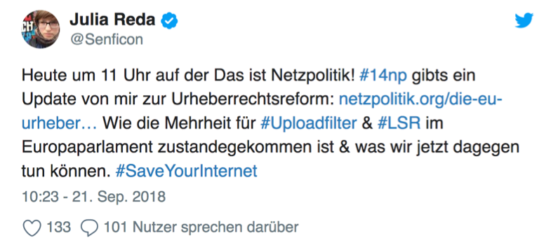 On 21 September 2018, the fifth “Das ist Netzpolitik!” [“This is net politics!”] conference took place in Berlin. One of the speakers was Julia Reda, the sole representative of the Pirate Party in the EU parliament. At the conference – addressing her supporters and requesting that they write to EU parliamentarians – she said: