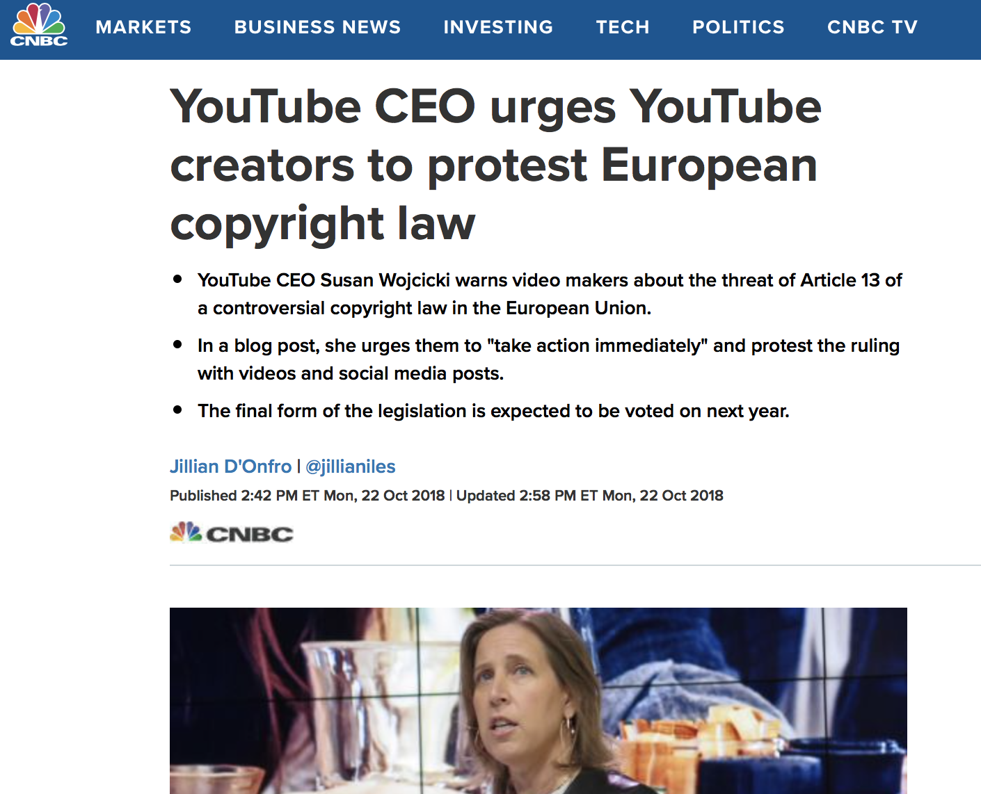Desperate times for YouTube. CEO Susan Wojcicki is currently organizing a Childrens Crusade, against EU MEPs by urging YouTubers (mostly US teens) to “take action” to protect her $772 billion dollar company’s swollen profits. You see the EU just proposed guidelines (article 13) requiring platforms like YouTube to stop hiding behind its users and pay musicians fairly. She thinks that is an outrage and is spreading wild disinformation.