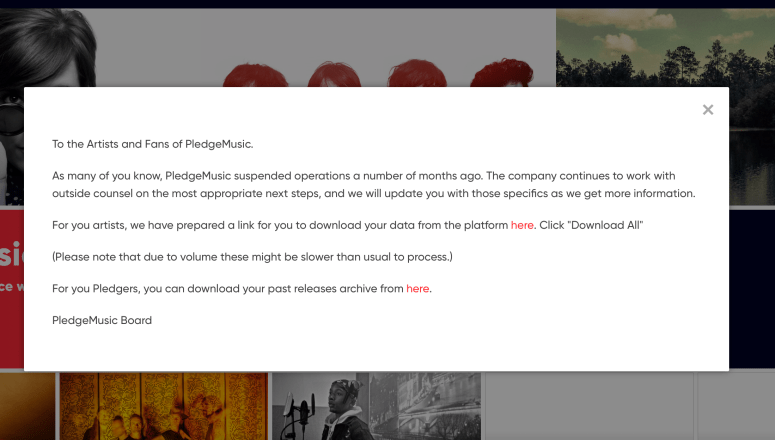 Here is the current website notice. Completely lacking in specifics. Nothing about administration. Maybe this is normal. Maybe it’s not. I will say that publicly available documents indicate the financial history of Pledge Music is extraordinarily complex. And if I were an administrator or creditor I would have a lot of questions. This could be the reason for the delay.