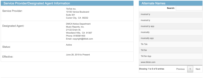 So MRI’s appearance on both sides of the streaming music marketplace raises eyebrows. But to be clear that is not illegal. However, I’ve never seen anything quite like this: MRI is the DMCA Agent for TikTok! That means a company that is supposed to be licensing artists and rightsholders work is aiding and abetting a massive infringer (TikTok*) in a whac-a-mole DMCA scam.