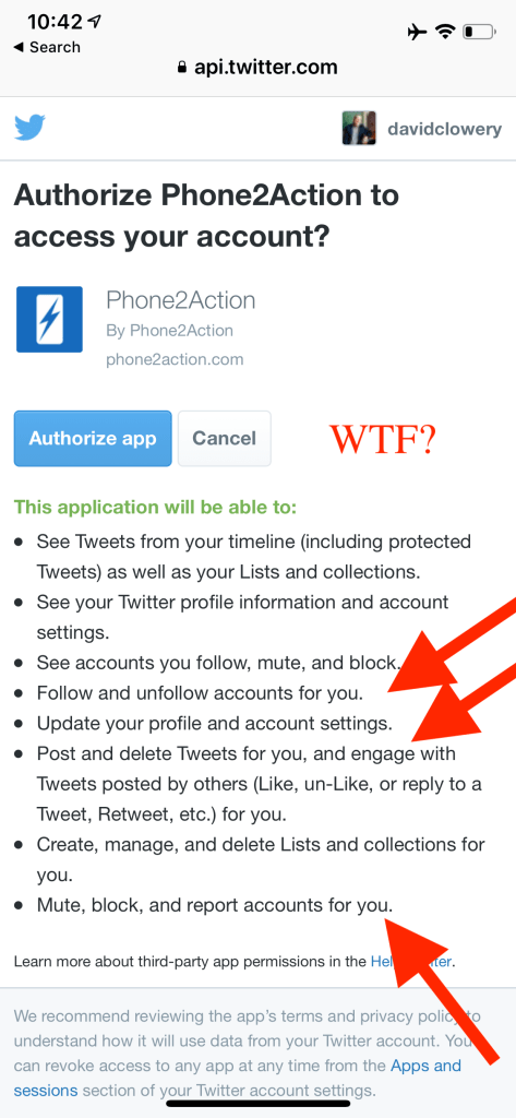 As we dug into this, we started focusing on Public Knowledge and their tweetbot. While experimenting with the tweetbot, I discovered it took total control of my twitter account. Like completely. It basically makes your twitter account part of a botnet that is controlled by Public Knowledge or their agent Phone2Action. Look at the permissions it asks for: