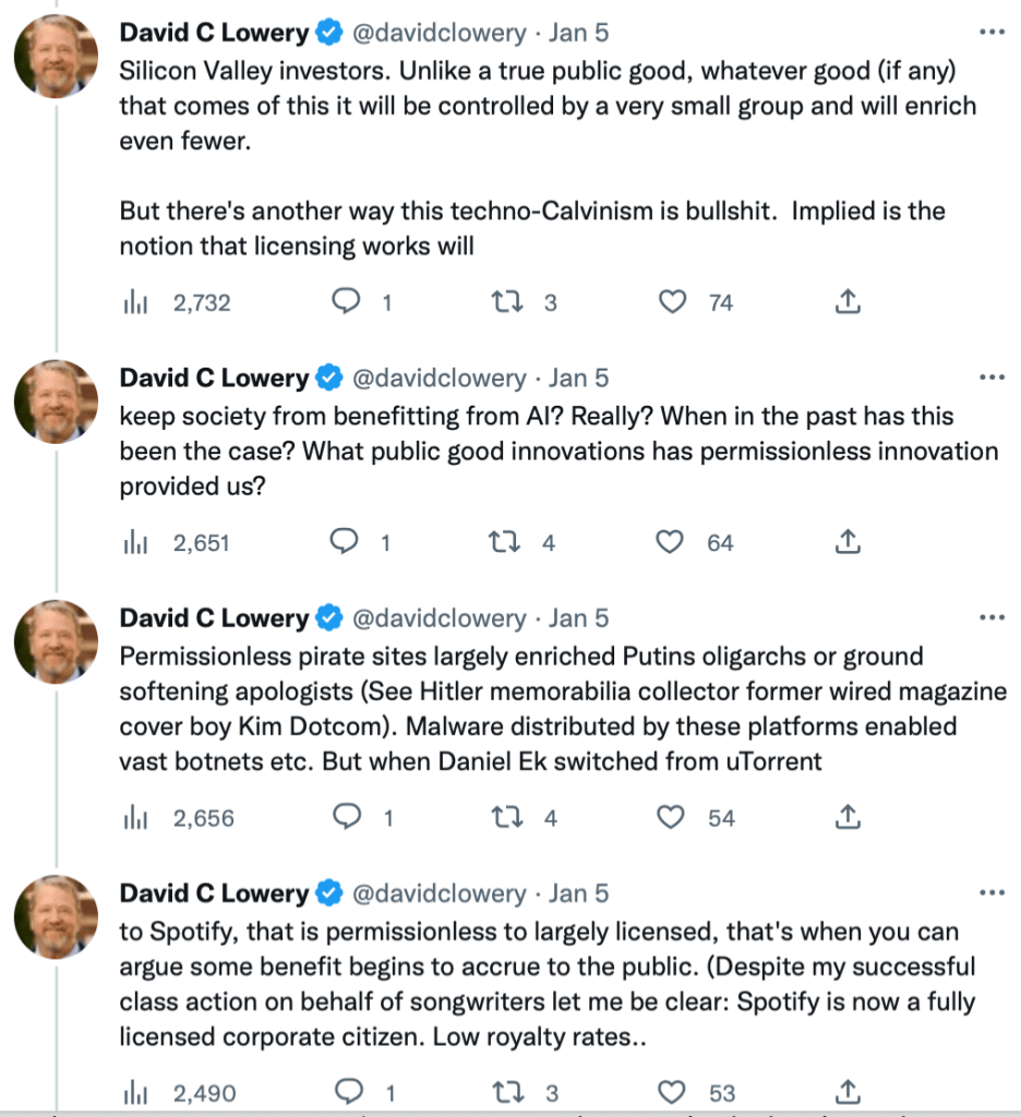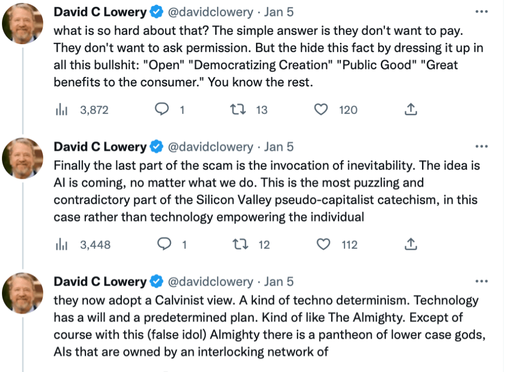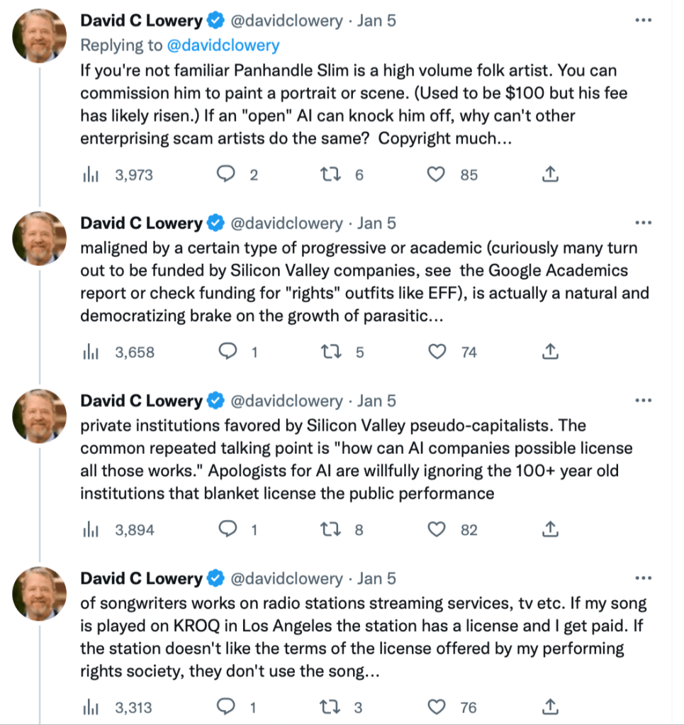 The second trick these cynical pseudo capitalist opportunists are playing is that nothing is really"owed" to creators because no one is harmed, AI is simply creating new works, based on collective Artist impulses. Really? The why can I input "in the style of Panhandle Slim"…