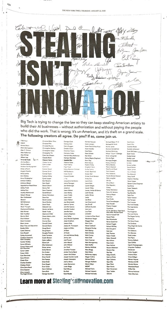 Artists aren’t raw material. They’re rights-holders under U.S. law. Rewriting those rights to subsidize AI business models isn’t progress—it’s a policy choice to reward theft at scale.