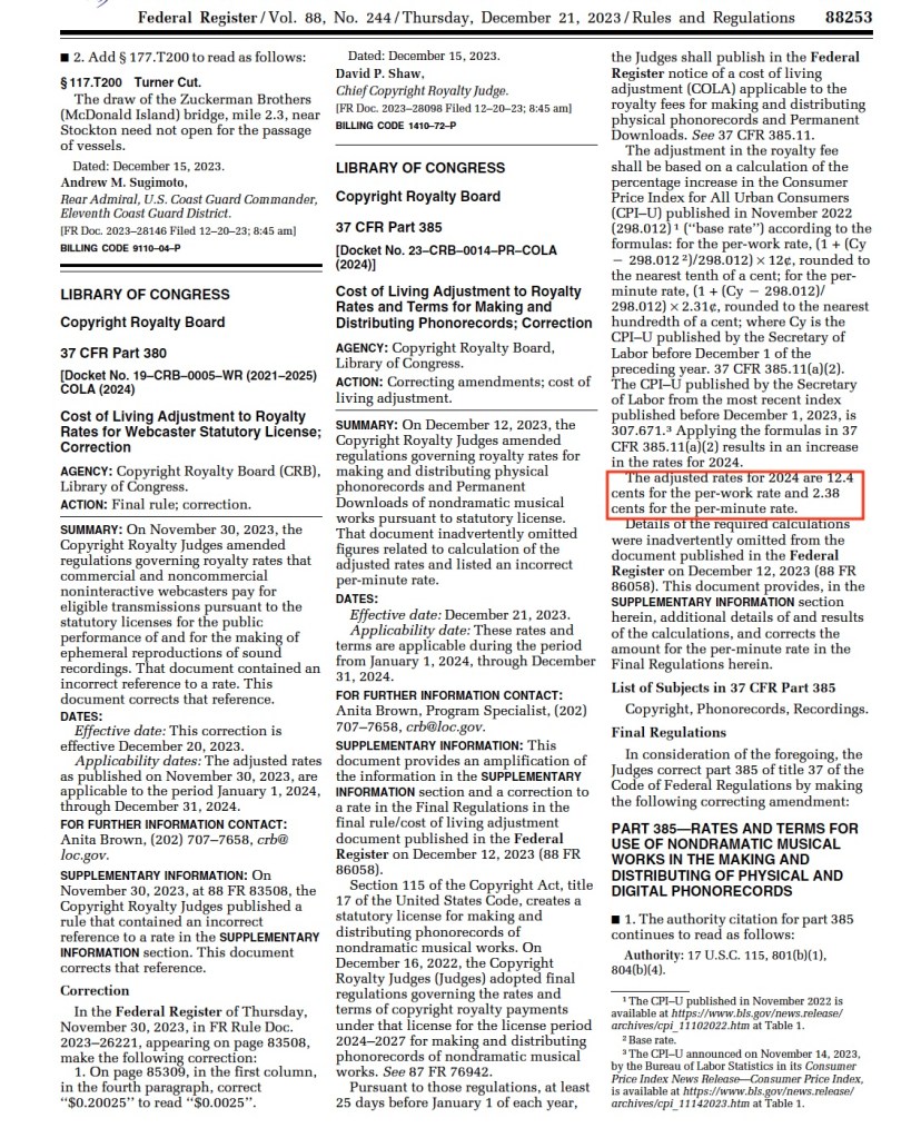 The Copyright Royalty Judges announced the new COLA rate yesterday which has increased to a minimum rate of 12.40¢ for recordings of songs with a running time of 5 minutes or less, and a per-minute long-song rate of 2.39¢. Depending on how frequently you get accountings, you could see that COLA rate increase show up on your next statements for sales after 1/1/24.