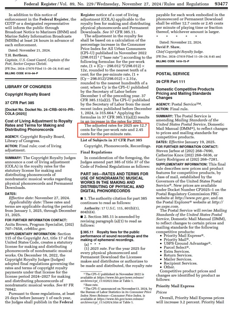 As you probably already know, the statutory mechanical royalty rate for physical or downloads (not streaming) has increased as of January 1, 2025. This means that all floating rate licenses (e.g., not subject to controlled comp rates) should have increased as of January 1, 2025 from 12.4¢ to 12.7¢ due to the Phonorecords IV cost of living adjustment. (And of course should have increased in prior PR IV years in 24.). And of course we have Trichordist readers to thank for helping to persuade the Copyright Royalty Judges to reject the Phonorecords IV frozen mechanical rate settlement that led to the labels agreeing to an increase from 9.1¢ to 12¢ plus a cost of living adjustment on physical and downloads that rose to 12.4¢ in 2024 and now to 12.7¢ in 2025. (But remember there is no cost of living adjustment for streaming mechanicals like Spotify.)