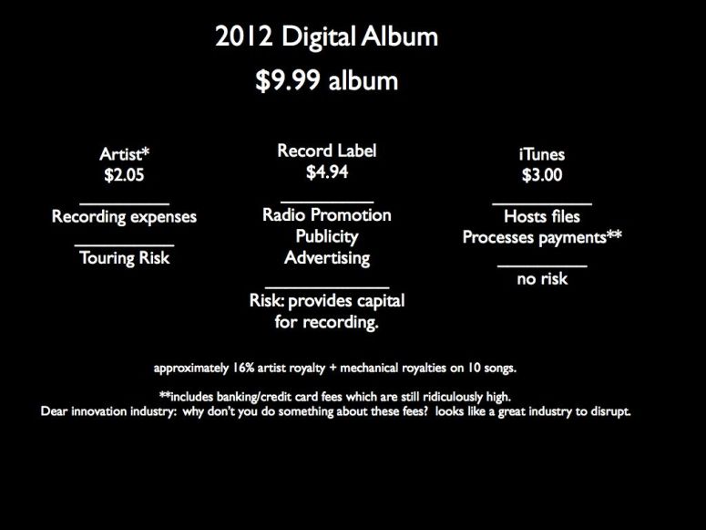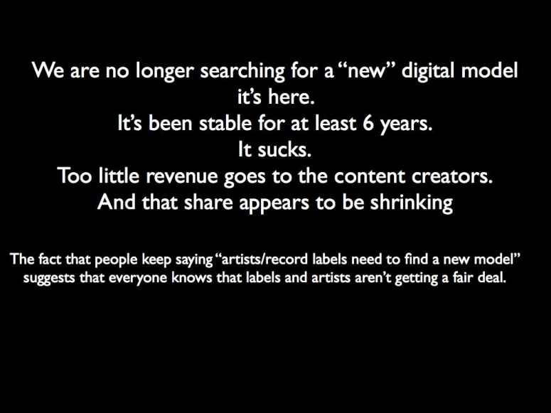 What follows is based on my notes and slides from my talk at SF Music Tech Summit. I realize that I’m about to alienate some of my friends that work on the tech side of the music business. These are good well intentioned people who genuinely want to help musicians succeed in the new digital paradigm. But if we are gonna come up with a system to compensate artists fairly in the new digital age we need an honest discussion of what is going on. The tech side of the music business really needs to look at how their actions and policies negatively impact artists, just as they have pointed out the negative effect record company actions have had on artists.