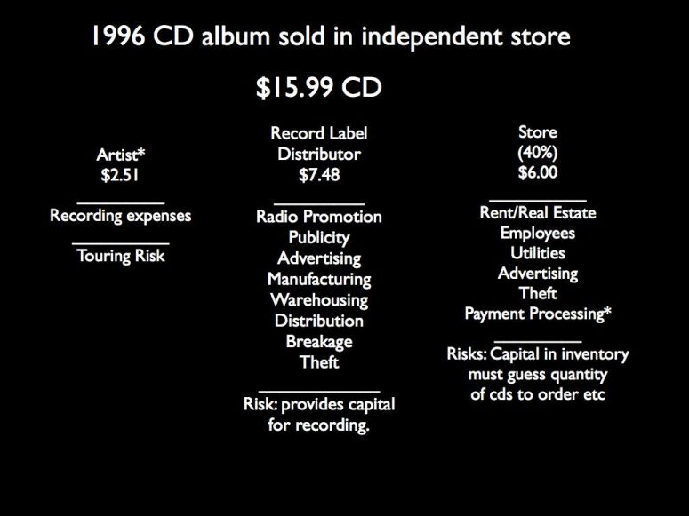 In actuality a much higher share of revenue goes to most artists under a typical record deal. In the 1990‘s typical deals were 15-25% of wholesale. I’m told some superstars got as much as 50%. Add another 70-95 cents for mandatory and statutory “mechanical royalties”. And your “typical’ artist was getting more than 25% of wholesale on physical CDs.
