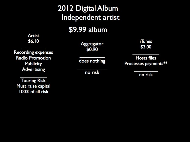So at last we get to the part of the new digital paradigm where things should work as promised. The independent artist on their own label who directly releases their recorded music through iTunes, Amazon Mp3 store etc. This is where we would expect to find the artists benefiting from the process of “disintermediation”. This is where we should find the artists that are capturing the lions share of revenue. This is where we should find that vibrant marketplace of small stakeholders competing with multi-national conglomerates. This is where the playing field should be even. This is what the tech visionaries promised us anyway.