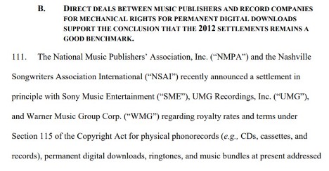The sticking point for most people commenting in the Trichordist is that the terms of the private settlement are not disclosed to the CRB or to the public, especially a side deal between the Big Three and the NMPA.  Songwriters around the world have no way of knowing the terms of these deals unless the Copyright Royalty Board forces their disclosure.