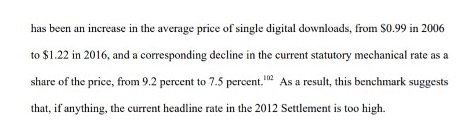 Pandora not only used the settlement to make the case that the streaming mechanicals rate in the 2012 settlement was a “good benchmark,” but also, even more disastrously, used this argument to rationalize the 2012 rate being TOO HIGH.