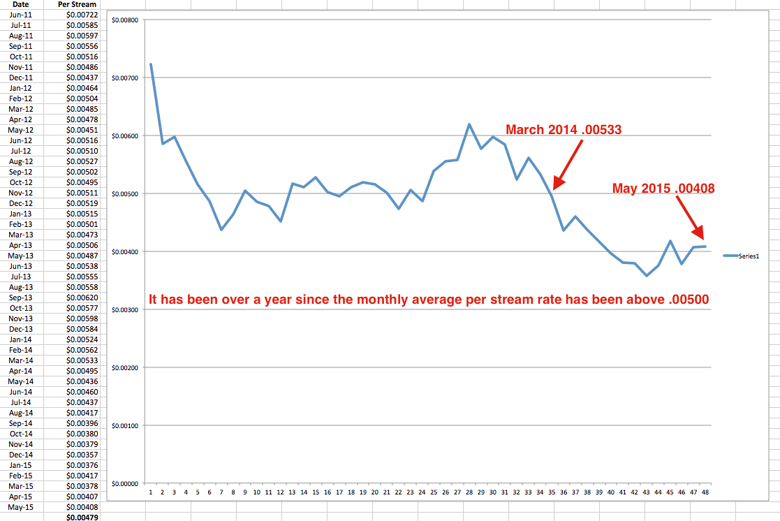 We’re already seeing this trend as we noted earlier this year that Spotify per stream rates appear to be dropping steadily by about 8% per year. This is likely a combination of both the growth of consumption and the slowing of revenue across both subscriptions and advertising.