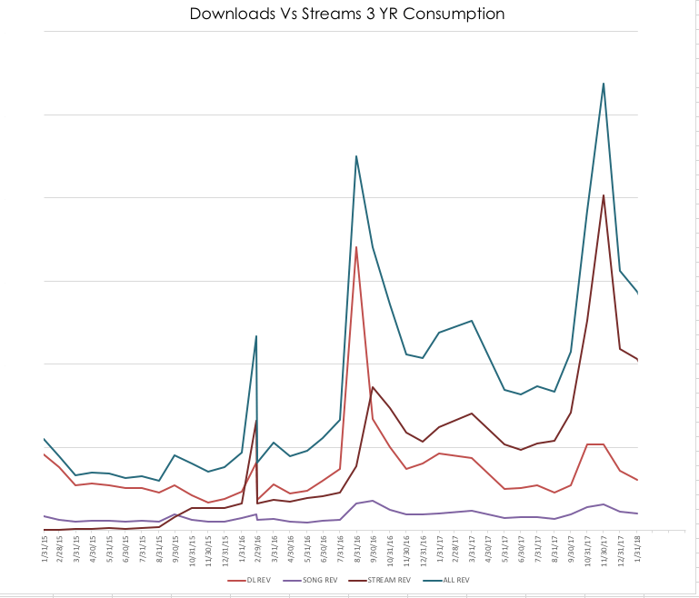 [NOTE:] Chart from a mid size indie label showing revenues from Downloads and Streaming. The Spikes indicate new release activity / hits which reveals that revenue tails off for streaming the same way it does for transactional downloads.