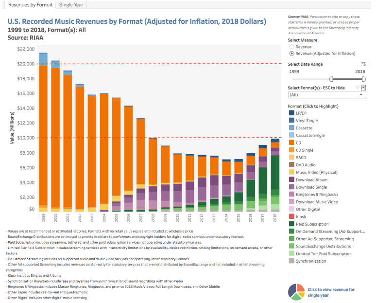 Note: It’s almost impossible to buy a new car or laptop that plays a CD. Low income streaming has effectively replaced higher income physical sales.